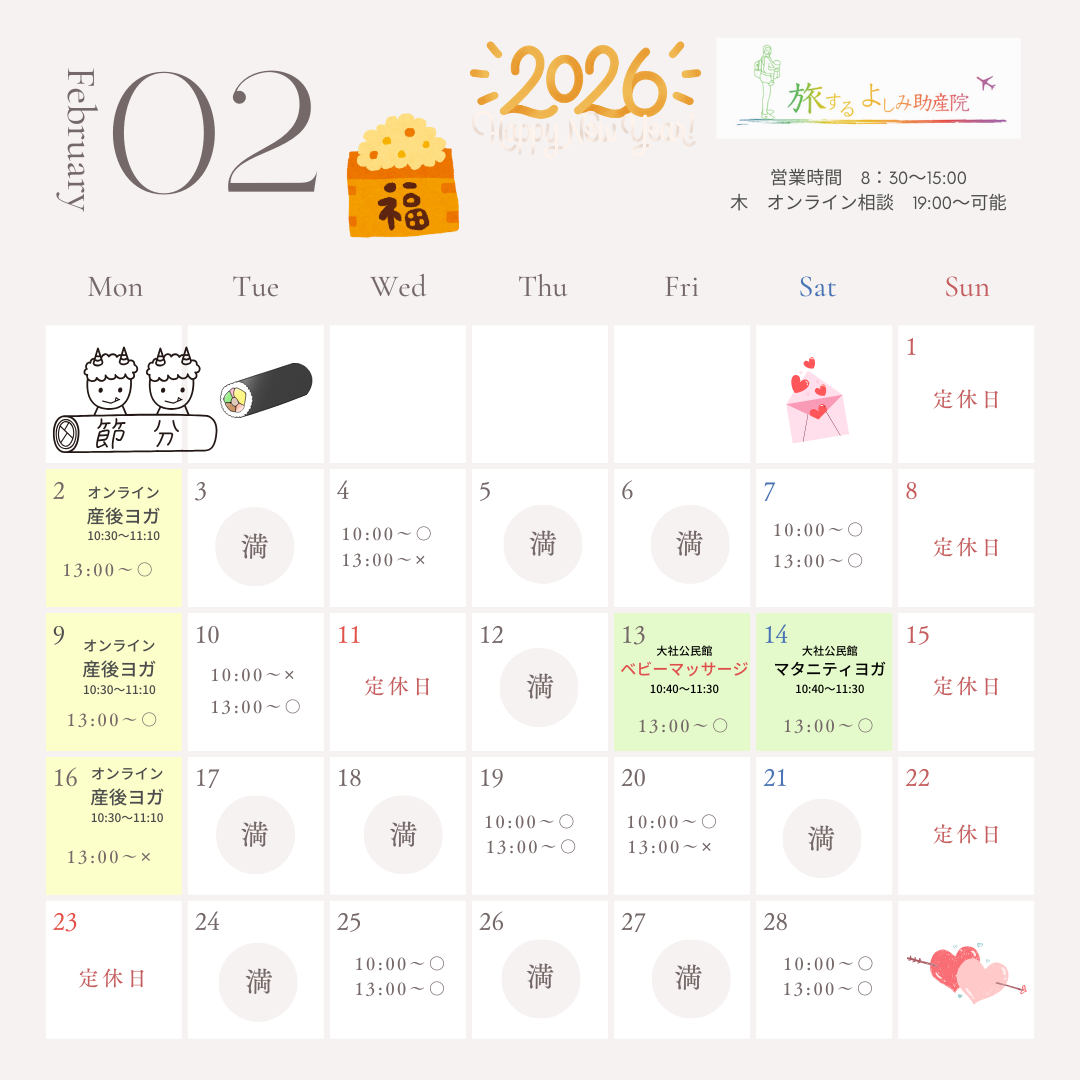 投稿の最終変更日:2026年1月26日 投稿カテゴリー:カレンダー 2026年2月のカレンダーをアップしました ⚪︎のところは訪問可能です。お問い合わせください。 おすすめ 大社公民館でマタニティヨガを開催します 2025年11月26日 2026年3月のカレンダーをアップしました 2026年2月26日 2026年1月のカレンダーをアップしました 2025年12月25日